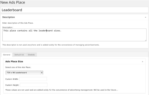 Go to "Ads" -> "New Place" to begin creating our "Leaderboard" ad place. We will title it "Leaderboard", give it a brief description, and set the size to 768x90 pixels.